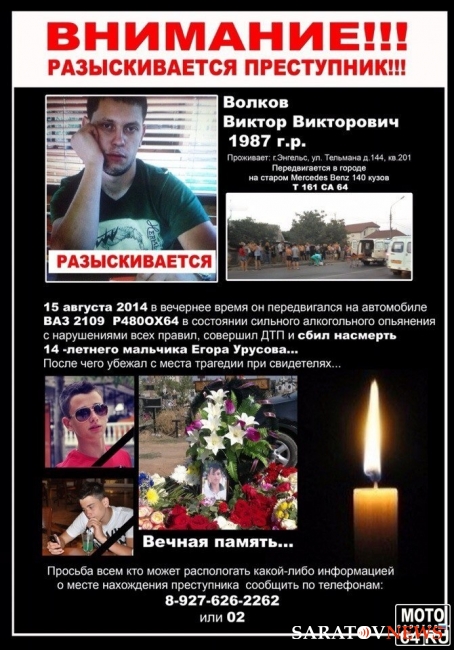 Ориентировка обвиняет в смерти подростка 27-летнего жителя Энгельса Виктора Волкова: вечером 15 августа он ехал на "девятке" с госномером Р480ОХ, будучи сильно пьяным и нарушая правила дорожного движения, сбил насмерть 14-летнего Егора Урусова и сбежал с места аварии на глазах свидетелей. Приводится также домашний адрес разыскиваемого и описание автомобиля "Мерседес", на котором он ездит обычно. Всех, кто располагает сведениями о его местонахождении, просят звонить по тел. 89276262262 или 02.