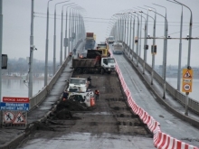 Сейчас ремонтные работы на мосту продолжаютс с низовой стороны. Рабочие устраивают слой литого асфальтобетона на проезжей части и верхнего слоя покрытия из щебеночно-мастичного асфальтобетона, ведутся работы на деформационных швах.