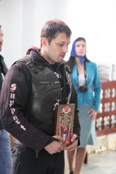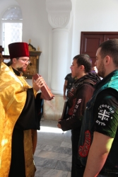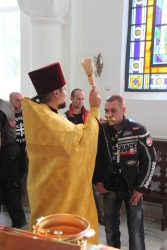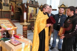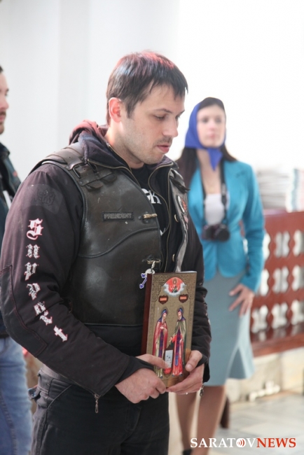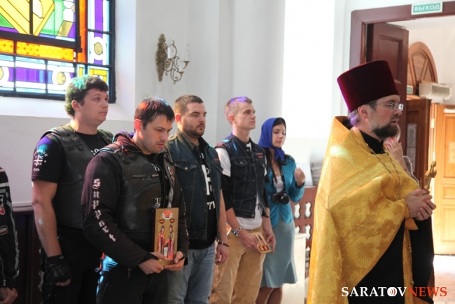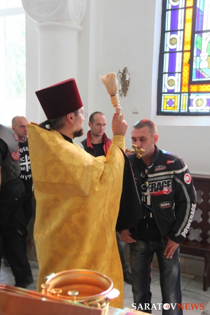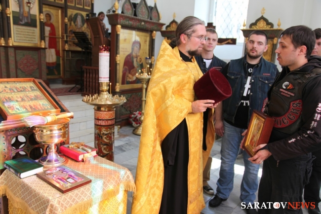 В храме в честь иконы Богоматери "Утоли моя печали" священник Василий Куценко вместе с участниками пробега отслужил молебен о путешествующих. По окончании член Саратовского отделения "Ночных волков" Вадим Строгов подарил храму икону святых воинов Пересвета и Осляби, 100 экземпляров Евангелия и 10 книг о святом Пересвете. Отец Василий Куценко в ответ передал паломникам икону святителя Николая.