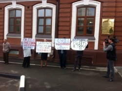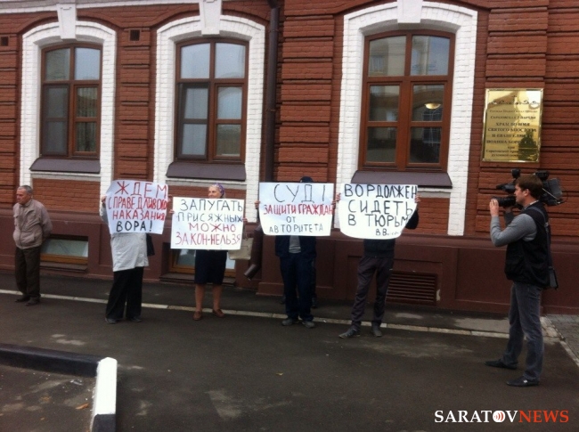 Участники акции выстроились напротив здания областного суда и держали в руках плакаты с лозунгами "Вор должен сидеть в тюрьме", "Ждем справедливого наказания вора", "Запугать присяжных можно, закон нельзя", "Суд, защити граждан от авторитета".