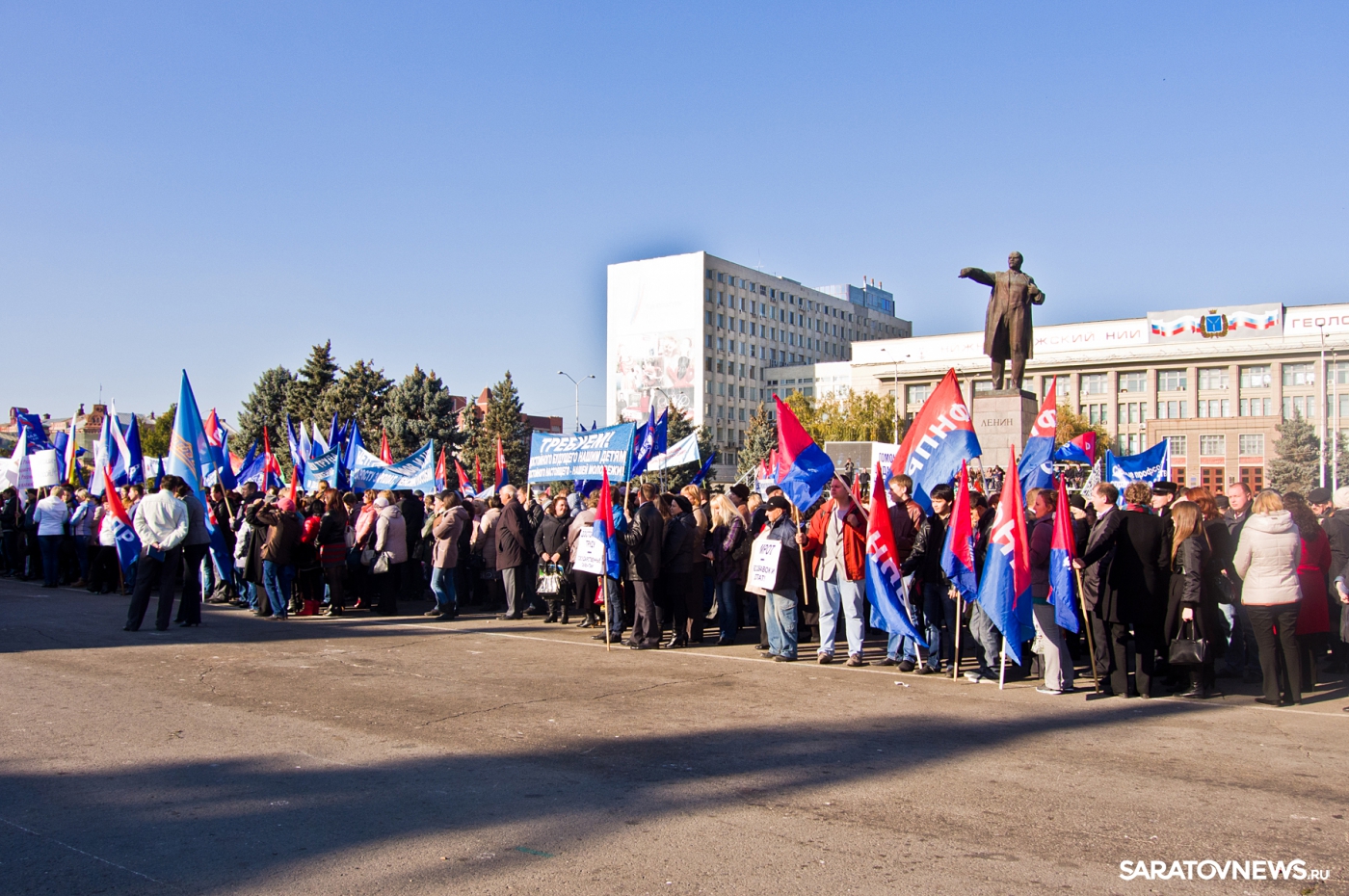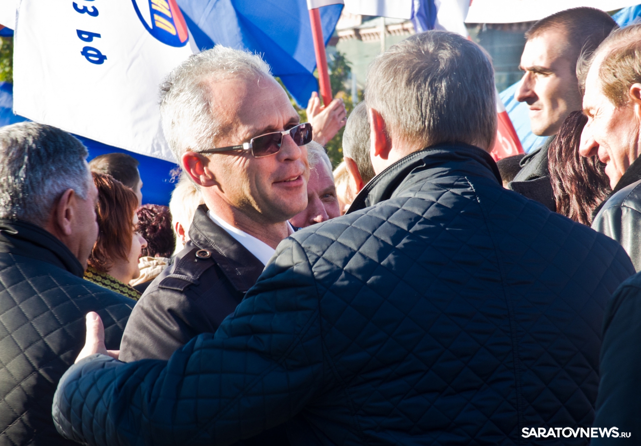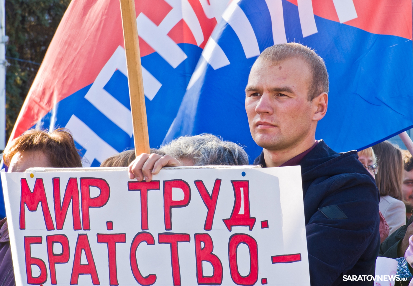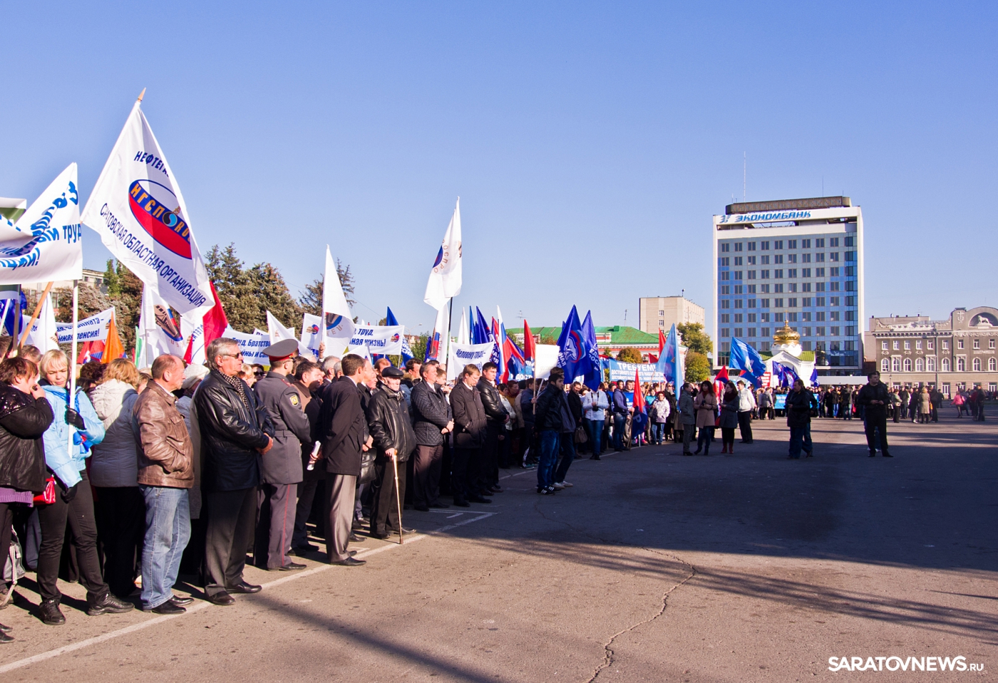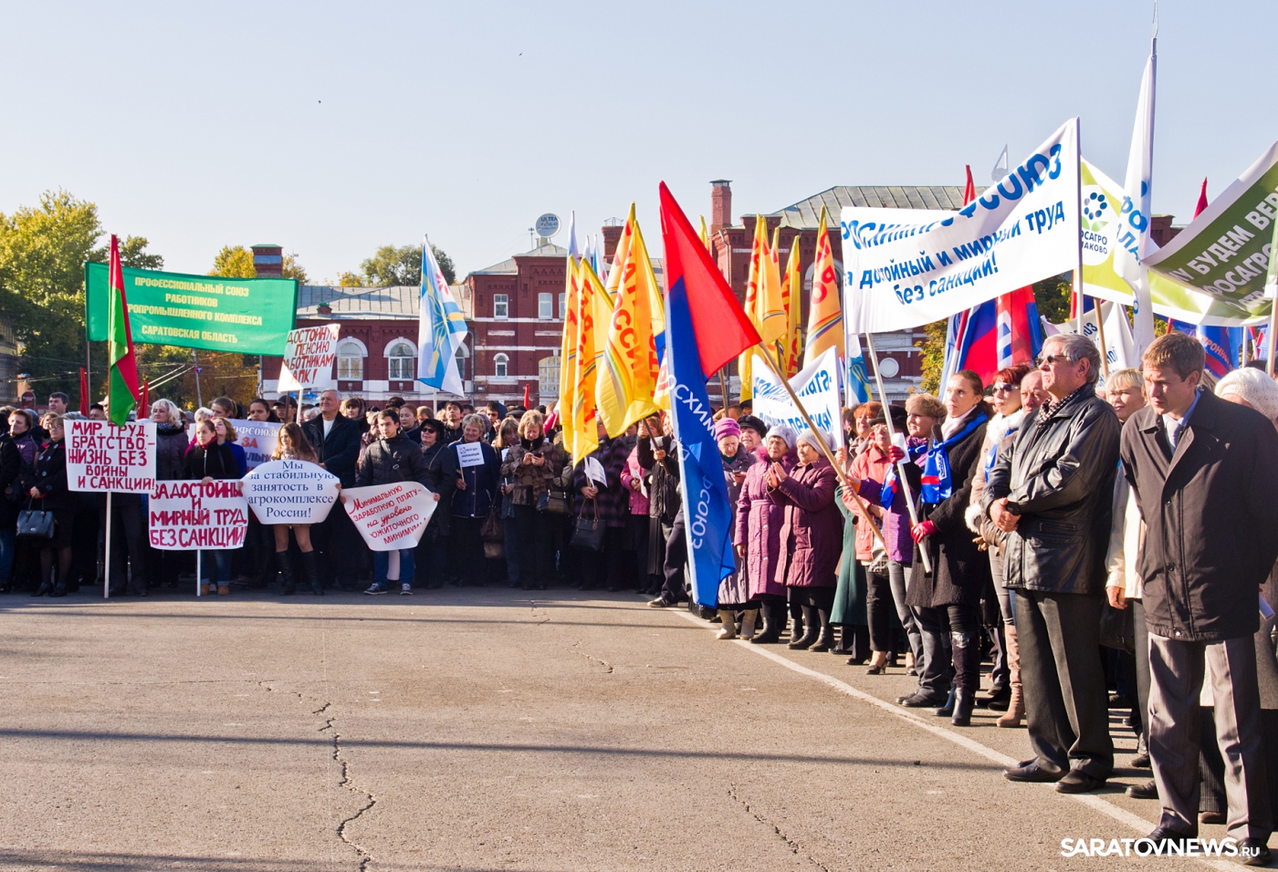 "Мы работаем на рост экономики, модернизацию промышленности, создание современных рабочих мест, повышение качества жизни. И равняемся - на человека труда, которого Президент назвал гордостью и опорой страны, кормильцем России!", - отметил Валерий Радаев в своем приветственном слове к участникам митинга. Далее он напомнил, что благодаря социальному партнерству в регионе снижается уровень безработицы - только с начала года создано около 11 000 рабочих мест; растет зарплата бюджетников, уровень которой приближен к средней по экономике. В Саратовской области права работников защищают 6 000 коллективных договоров и свыше 200 трудовых соглашений. Двенадцать лет подряд заключается трехстороннее соглашение между правительством, профсоюзами и предприятиями. По словам Радаева, современные внешнеполитические условия требуют от ее населения "координации действий, поиска новых решений, пересмотра экономических планов".