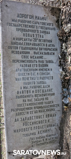 Весной 2014-го группа краеведов нашла на бывшей территории саратовского завода метизов имени Ленина выброшенную новыми владельцами заводских помещений мемориальную плиту, оказавшуюся памятником культуры регионального значения. Надпись на ней являлась цитатой из письма заводчан Владимиру Ленину, датированного 7 ноября 1922 года, в котором пролетарии выражали желание назвать предприятие именем вождя и внести его в список почетных работников предприятия. Денис сообщает, что его обращение разошлось по всем инстанциям, но по факту препроводить плиту на ее законное место во вновь создающийся региональный музей трудовой славы удалось только после того, как ее в очередной раз, уже в октябре, "обнаружили" работники фирмы, занимающейся вывозом бытовых отходов.