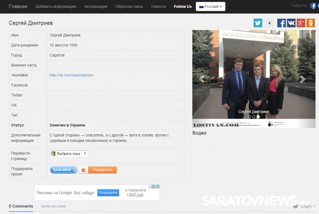 Сотрудник службы спасения Саратовской области Сергей Дмитриев появился на сайте "LostIvan: груз 200 из Украины в Россию", создатели которого формируют список без вести пропавших на Донбассе.