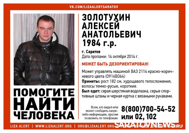 В социальных сетях распространили сообщение об исчезновении 30-летнего Алексея Золотухина. Мужчина перестал выходить на связь со знакомыми и родственниками 14 октября.