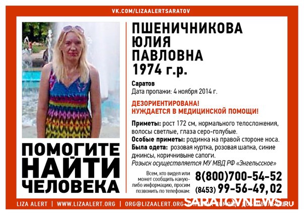 Последний раз женщина пропадала 25 августа, найти ее удалось лишь 3 сентября. Всем, кто что либо знает о судьбе Юлии, можно звонить по номерам: 8(800)700-54-52; (8453)99-56-49; 02.