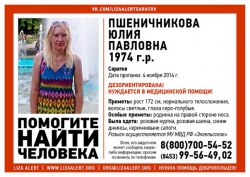 Волонтеры поискового отряда Лиза Алерт снова заявили о пропаже 40-летней Юлии Пшеничниковой, сообщается в группе движения. Она ушла из дома 4 ноября и до сих пор не вернулась, может быть дезориентирована и нуждается в квалифицированной медицинской помощи.