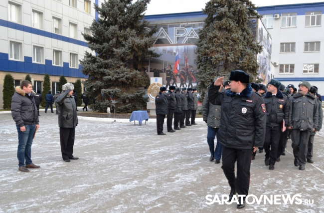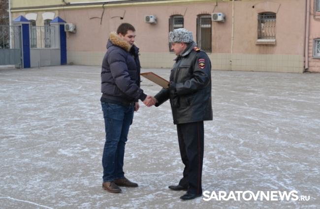Во время еженедельного развода на службу начальник УМВД России по Саратову Александр Макаров отметил поступок Алексея Сахарова и Михаила Пантелеева, наградив благодарственными письмами.