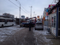 "Вчера во время эвакуации машины недалеко от Сенного рынка, эвакуторщики порвали переднее колесо автомобиля. Вместе с гаишником испугались, быстро отцепили машину и уехали, оставив машину в таком виде поперек тротуара", - рассказали горожане и приложили фотографии в качестве подтверждения своих слов (орфграфия и пунктуация - авторские; прим.ред.).