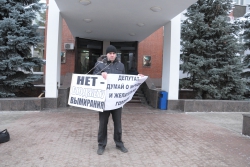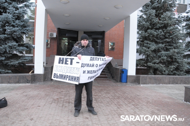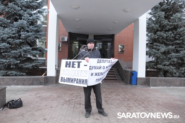 Сегодня журналисты, которые направлялись на заседание Саратовской городской думы, могли наблюдать возле здания облдумы секретаря горкома КПРФ Александра Анидалова, который стоял нан пикете. Журналистов он приветствовал словами "Вы тоже идете на это заседание, где будет принят не проиндексированный с учетом инфляции бюджет?" Он держал в руках два плаката: "Нет - бюджету вымирания" и "Депутат, думай о народе и желательно - головой". Так как последний плакат не нес партийной направленности, можно предположить что что обращен он был ко всем парламентариям, в том числе и к коммунистам Андрею Карасеву, Геннадию Турунтаеву и Денису Шумихину.