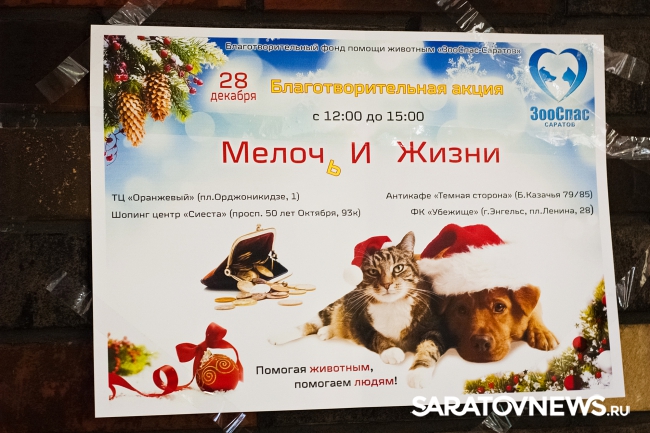 В минувшее воскресенье, 28 декабря, в трех точках Саратова и одной - Энгельса волонтеры фонда "ЗооСпас" собирали мелочь в помощь своим подопечным. Акция называлась "Новогодние мелочи жизни" и проходила при поддержке мэрии Саратова.