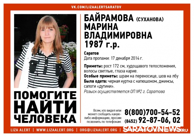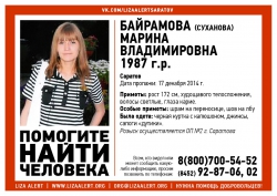 В Саратове разыскивают пропавшую 28-летнюю Марину Байрамову, сообщается в группе "Лиза Алерт" в "Контакте". Девушка не вернулась домой еще 17 декабря.