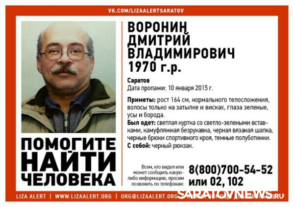 Поисково-спасательный отряд "Лиза Алерт в Саратове" сегодня, в среду 21 января разместил на своей официальной странице "ВКонтакте" ориентировку на поиск пропавшего 10 января 44-летнего горожанина по имени Дмитрий Воронин.