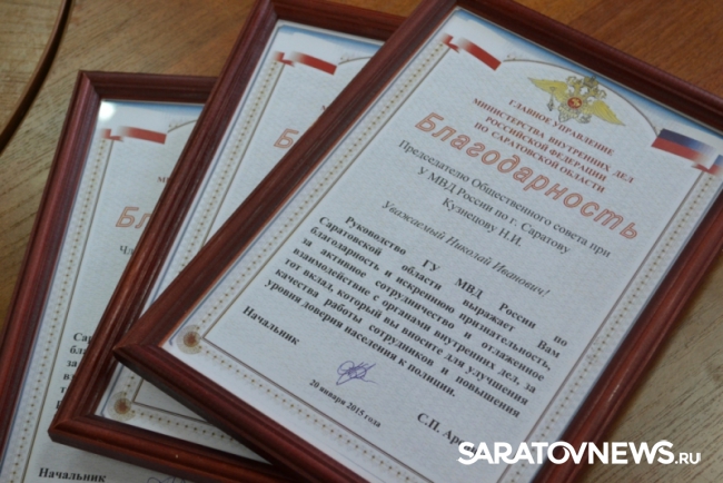 Полицейские не оставили без внимания возросшую активность общественников в решении вопросов охраны правопорядка. За сотрудничество с органами внутренних дел и правовое воспитание молодежи благодарственные письма за подписью начальника ГУ МВД России по Саратовской области генерал-лейтенанта полиции Сергея Аренина получили председатель Общественного совета при ГУ МВД по Саратову Николай Кузнецов, член совета Егор Григорьев и участник добровольной народной дружины Игорь Попов.