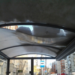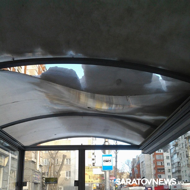 Остановочный павильон на углу Октябрьской и Чернышевского в Волжском районе Саратова деформировался из-за слежавшегося снега на крыше. Конструкция крыта сводами из тонких листов полупрозрачного пластика. На них во время недавних снегопадов скапливались массы снега и льда и, наконец, продавили крышу. Массив угрожает упасть на головы горожан, которые по-прежнему вынуждены пользоваться остановочным павильоном: из-за высоких отвалов снега на обочинах выход к проезжей части в этом месте возможен только у аварийного сооружения.