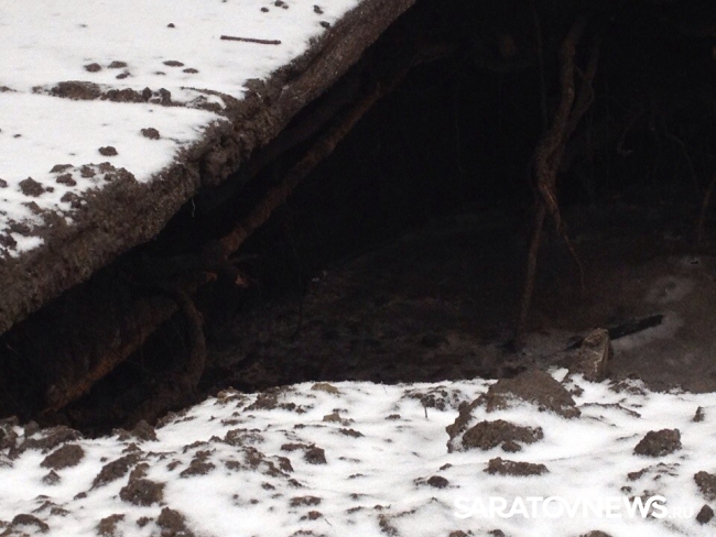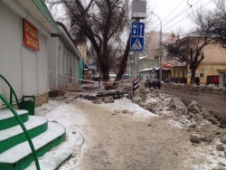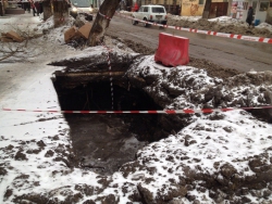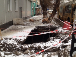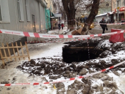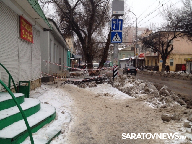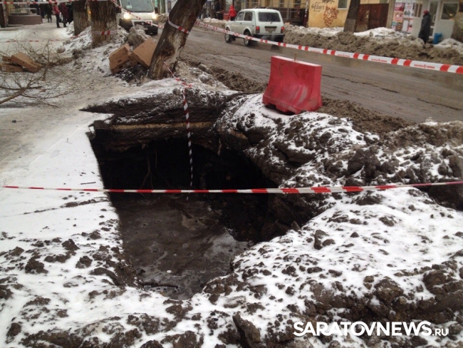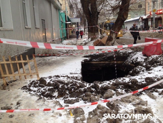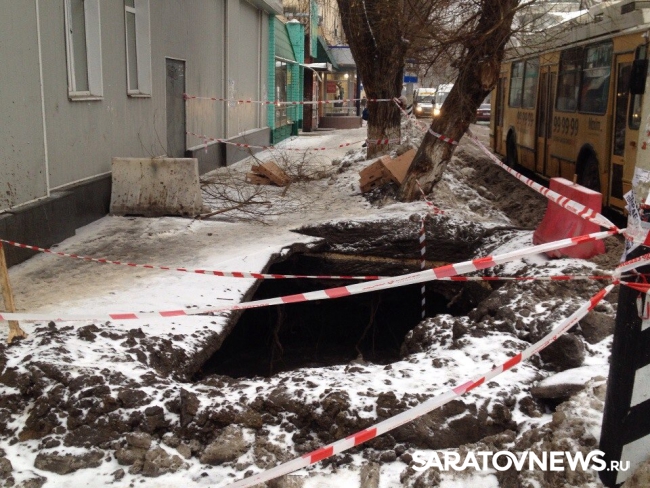 Сегодня в центре Саратова, на пересечении улиц Чернышевского и Соляной на тротуаре образовалась огромная яма. В настоящее время она уже огорожена и обозначена сигнальными лентами.
