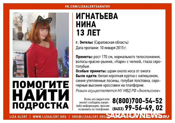 Розыск ведет Энгельсская полиция. Всем, кому известно что-либо о судьбе Нины, просьба сообщить по телефону: (8453) 99-56-49 или 02.