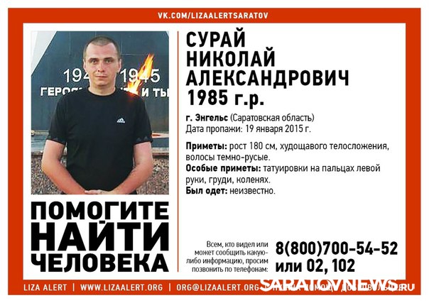 В Энгельсе Саратовской области полицейские и волонтеры ищут 30-летнего мужчину по имени Николай Сурай, пропавшего без вести 19 января. Ориентировка на его розыск появилась в официальной группе "ВКонтакте" поисково-спасательного отряда "Лиза Алерт".