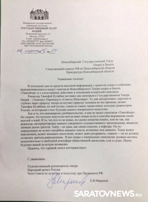 Вчера Государственный Театр Наций, которым руководит уроженец Саратова Евгений Миронов, опубликовал на официальной странице в Facebook скан открытого письма своего худрука в поддержку Тимофея Кулябина, который оказался под судом из-за того, что праворадикалы Новосибирска нашли нечто оскорбительное в спектакле "Тангейзер", поставленном в местном театре. Против спектакля 1 марта в Новосибирске прошел митинг, о котором портал "Новосибирские новости" писал, что там собралось до тысячи человек, причем официальных представителей РПЦ не было ни одного. Тем не менее, церковь выступает в качестве стороны конфликта. Судебное разбирательство началось после заявления митрополита Новосибирского и Бердского Тихона в прокуратуру, сделанного по поводу спектакля, которого он сам не видел, но составил впечатление со слов прихожан. В деле нет ни одного свидетеля, который бы доказал, что видел спектакль.