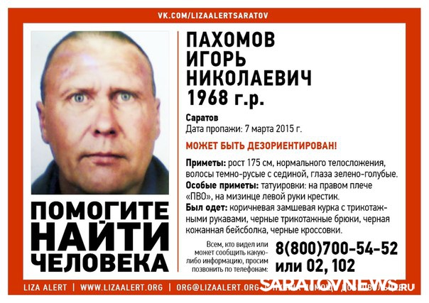 В Саратове полиция и волонтеры занимаются поиском пропавшего 7 марта 47-летнего горожанина Игоря Пахомова - такая информация сегодня, в четверг 26 марта, появилась в официальной группе "ВКонтакте" поисково-спасательного отряда "Лиза Алерт в Саратове".