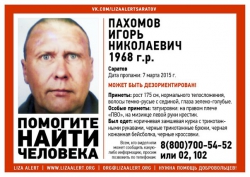 Сообщается, что пропавший мужчина может быть дезориентирован. Пахомов 175 см ростом, нормального телосложения, волосы русые с сединой, глаза зелено-голубые; из особых примет имеются татуировки: на правом плече - "ПВО", на мизинце левой руки - крестик. Был одет в коричневую замшевую куртку с трикотажными рукавами, черные трикотажные брюки, черную кожаную бейсболку, обут в черные кроссовки.