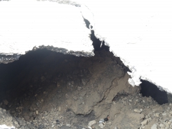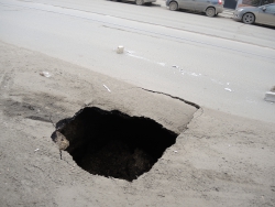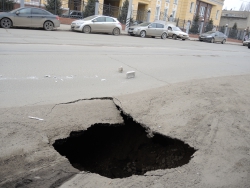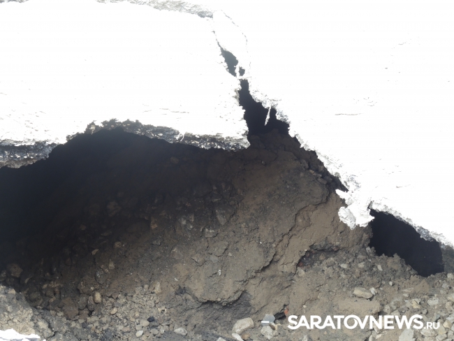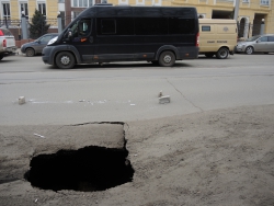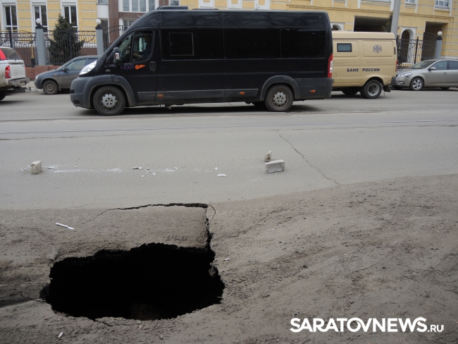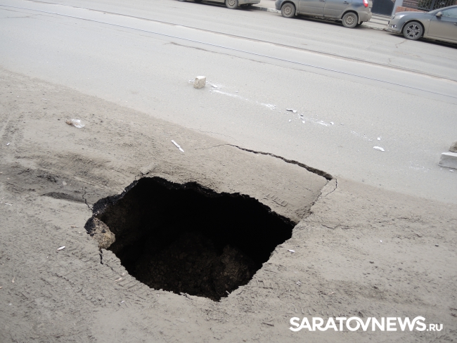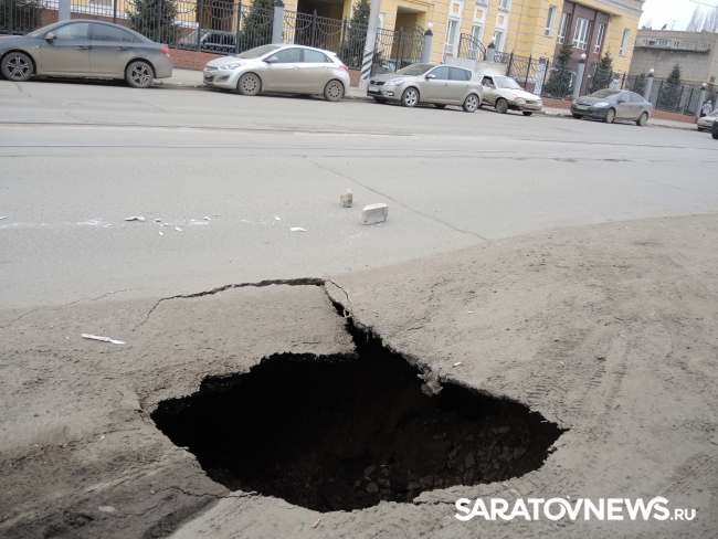 В Саратове на улице Кутякова напротив корпуса Саратовского государственного медицинского университета (недалеко от пересечения со Степана Разина) на проезжей части провалился асфальт. Дыра площадью не менее одного квадратного метра обнажает обширный провал глубиной также менее метра с оседающими грунтовыми стенками.