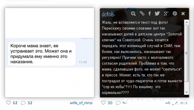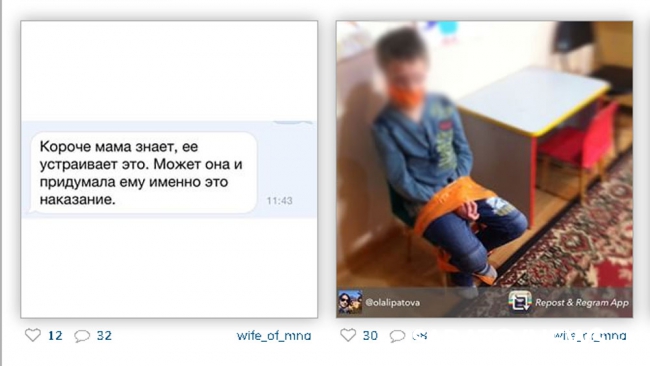 "Перескажу своими словами: вот так наказывают детей в детском центре "Золотой ключик" на Советской. Очень хочется передать этот вопиющий случай в СМИ, тем более, как выяснилось, наказывают так регулярно! Причем часто с молчаливого согласия родителей. Проблема в том, что мама, сделавшая фото, не может "светиться" в прессе. Может, есть те, кто так же пострадал от чудо-педагогов и готов вынести "сор из избы"?!!! По вашему, это нормально????", - озаботилась в своем инстаграме горожанка под ником wife_of_mna.