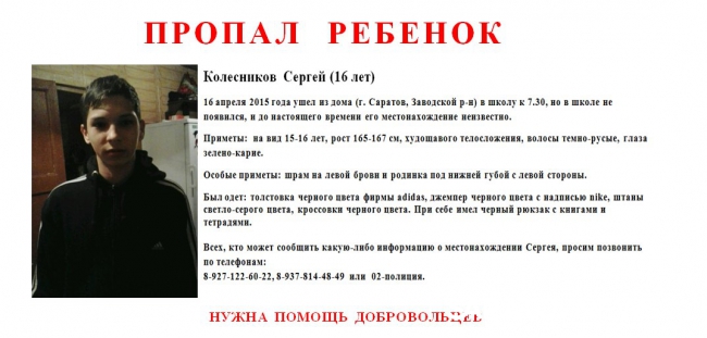 В Саратове разыскивают 16-летнего жителя Заводского района Сергея Колесникова, который в четверг 16 апреля ушел утром в школу, но на занятиях не появился, и с тех пор о нем ничего не известно. Информация о поиске подростка появилась в социальных сетях.