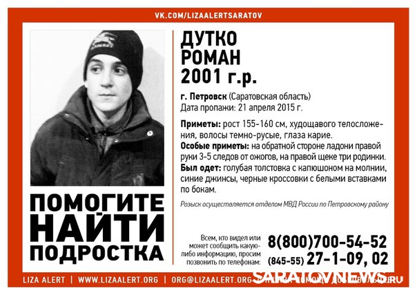 В Петровске Саратовской области разыскивается 14-летний Роман Дутко, пропавший еще 21 апреля, сообщается на официальной странице движения "Лиза Алерт". Молодой человек ушел из дома и не вернулся.
