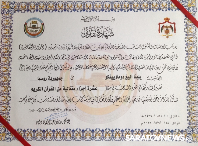 Саратовская чтица Священного Корана Елена Дмитриенко стала одной из 10 лучших в мире, сообщает пресс-служба ДУМСО по Саратовской области. Такие результаты учащаяся коранических групп при ДУМ показала на международном конкурсе в Иордании, который проходил 20-25 апреля под патронажем королевы Рании Абдуллы.