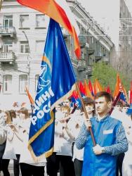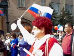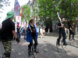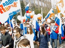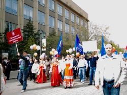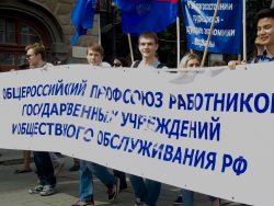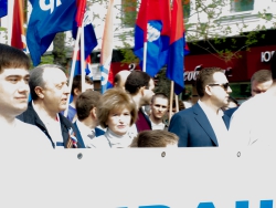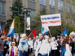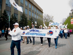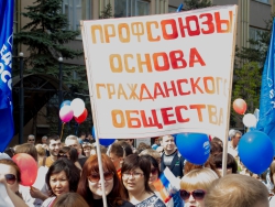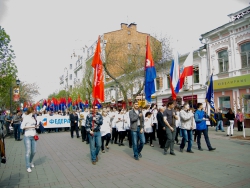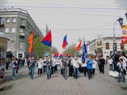 Митингующие шли под различными лозунгами: "Достойная зарплата - достойная пенсия!", "Каждому предприятию - коллективный договор!", "Не будь заложником "серой" зарплаты", "Пока мы едины - мы не победимы!", "Профсоюз - основа гражданского общества!", "Работающий человек не должен быть бедным!", "Растет квартплата - должна расти и зарплата!", "Три ЗА - зарплата, занятость, законность" (на некоторых плакатах добавлялось и четвертое - забастовка), "Май трудовой, май победный", "Мы за мир и стабильность", "Антикризисные меры в интересах человека труда", "В России заработал - в Россию вложи", "Государственная поддержка - реальному производству".