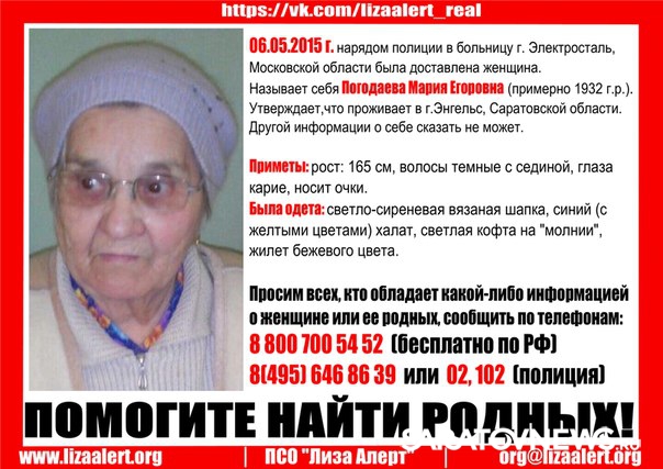 В Электростали Московской области разыскиваются родственники наденной там сегодня женщины, которая назвалась жительнице Энгельса Саратовской области Марией Погодаевой 83 лет, сообщает группа движения "ЛизаАлерт". Другой информации женщина вспомнить не смогла.
