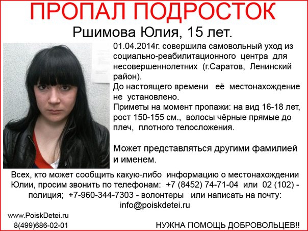 В Саратове с 1 апеля ведется поиск 15-летней Юлии Ршимовой, которая ушла из социально-реабилитационного центра для несовершенолетних в Ленинском районе и не подает о себе вестей.