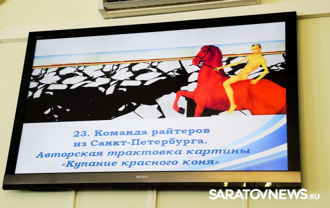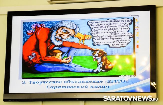 Наибольший энтузиазм в обсуждении у комиссии вызвали работы на тему "Саратовский калач". На первой же из них, за авторством художницы Марины Золотаревой, Федотов углядел "покемона Пикачу, поедающего саратовский мост". Вторая работа, принадлежащая творческому объединению "Ocean2motion", породила у комиссии ассоциации "наш ответ санкциям", "наши булки вывозят в оффшор", "летающая избушка бабы Яги" и "инопланетяне вывозят последний хлеб". Эскиз творческого объединения "EPITOZ" снискал одобрение, с оговоркой, что "автора нужно попросить, если это не противоречит в корне идее, лицо дяди сделать подобрее, а то сейчас он выглядит как злой продавец шаурмы, который собак и кошек приманивает".