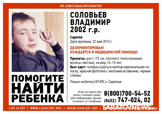 Сегодня в Кировском районе Саратова пропал 13-летний Владимир Соловьев. информация об этом появилась в группе Лиза Алерт. О мальчике известно, что он может быть дезориентирован и нуждается в медицинской помощи.