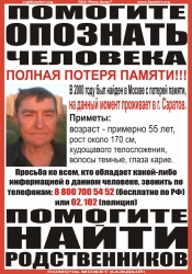 Известно, что мужчину, потерявшего память, в 2000 году нашли в Москве, а в настоящее время он проживает в Саратове. Ему на вид около 55 лет, его рост составляет 170 см, телосложение худощавое, волосы темные, глаза карие.