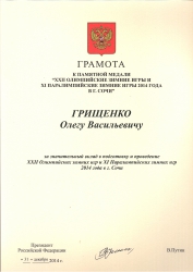 Глава Саратова Олег Грищенко награжден памятной медалью "XXII Олимпийские зимние игры и XI Паралимпийские зимние игры 2014 года в Сочи" от президента РФ Владимира Путина. Таким образом отмечен значительный вклад главы города в подготовку и проведение игр. К медали прилагается грамота, подписанная главой государства.
