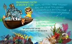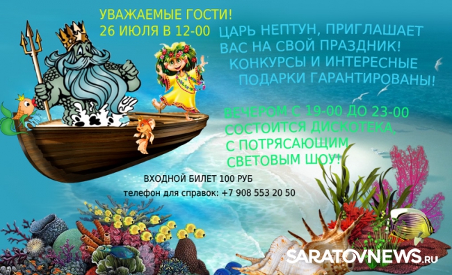 В воскресенье, 26 июля, турбаза "Островок" в Энгельсском районе Саратовской области приглашает всех на праздник Нептуна. Начао торжества - в 12:00, а с 19:00 до 23:00 состоится дискотека с потрясающим световым шоу.