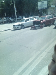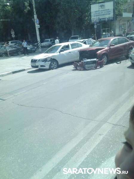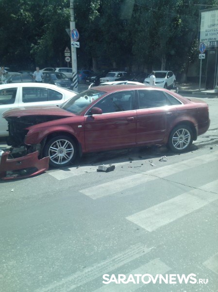 Сегодня днем в Саратове на улице Чапаева недалеко от "Авроры" произошло столкновение двух легковых иномарок: "Шкоды" и "Ауди". Удар был такой силы, что у немецкого автомобиля оторвало бампер и покорежило капот. "Шкода получила незначительные повреждения. Судя по положению автомобилей, они двигались в попутном направлении и "не поделили" полосу. Обе машины стоят на пешеходном переходе.