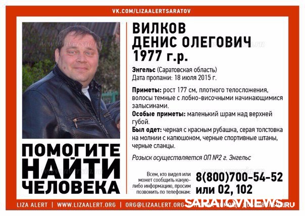 В Саратове полицейские и волонтеры разыскивают 38-летнего местного жителя Дениса Вилкова - информация об этом сегодня, в среду 5 августа, появилась на официальной странице "ВКонтакте" поисково-спасательного отряда "Лиза Алерт в Саратове".