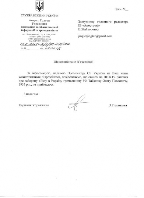 Знаменитый уроженец Саратова, актер и режиссер Олег Табаков избежал запрета на въезд в Украину - об этом сообщает украинское издание "Апостроф" со ссылкой на официальный документ, полученный от аппарата главы Службы национальной безопасности. "По состоянию на 10.08.15 решение о запрете въезда в Украину гражданину РФ Табакову Олегу Павловичу, 1935 г.р., не принималось", — отмечается в ответе на запрос.