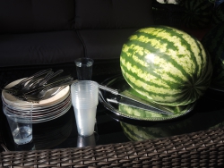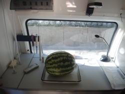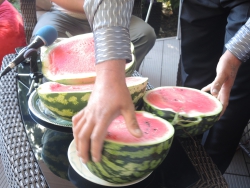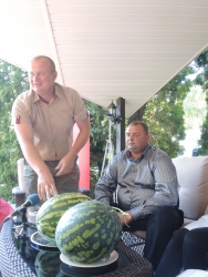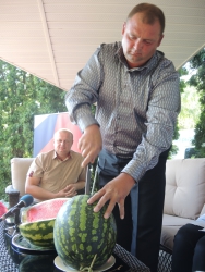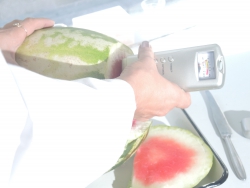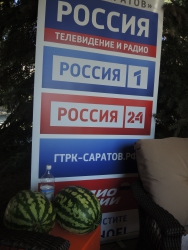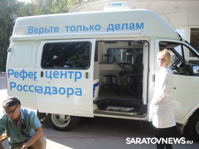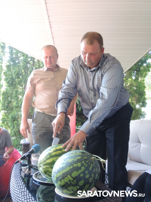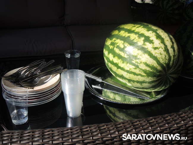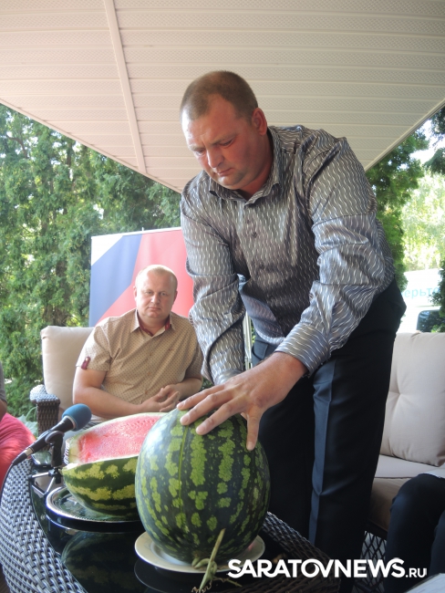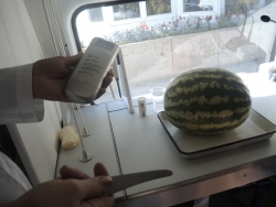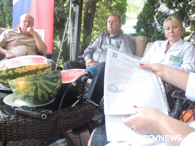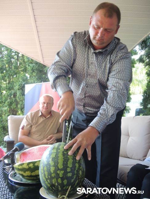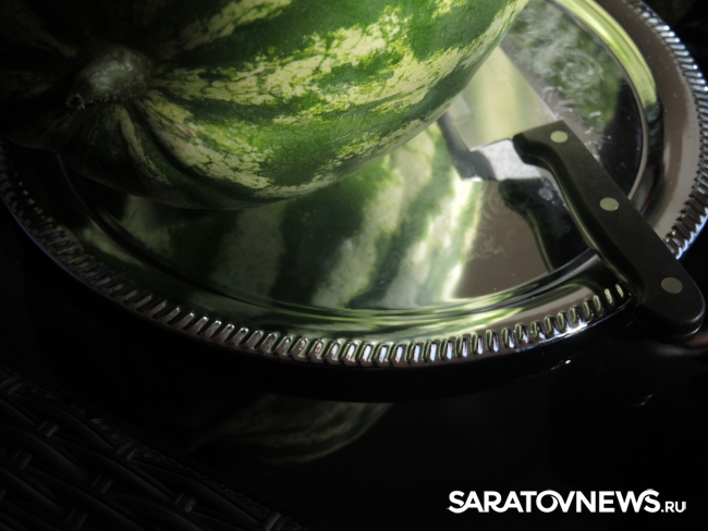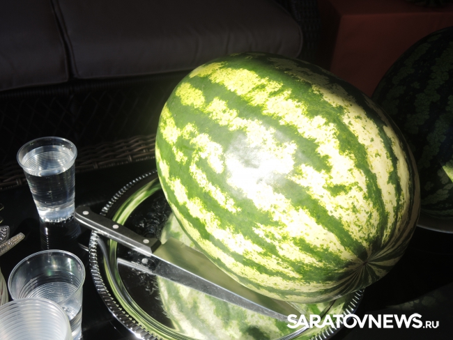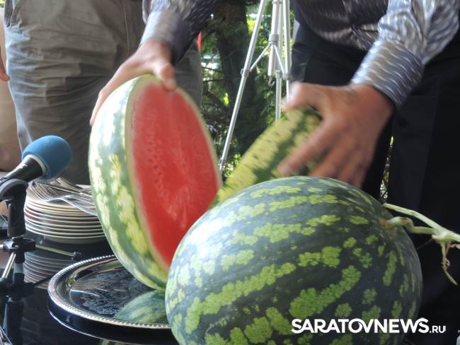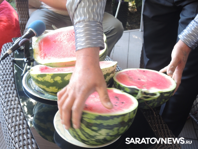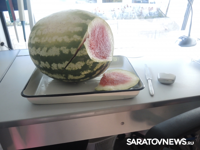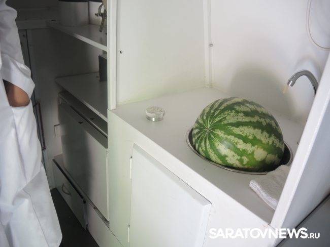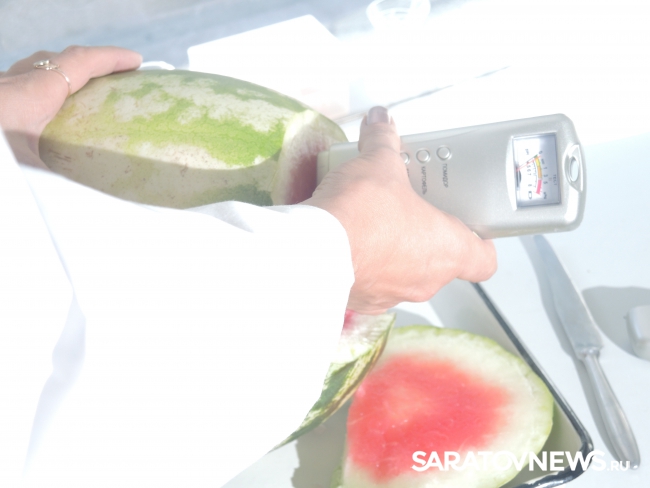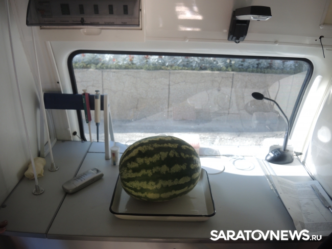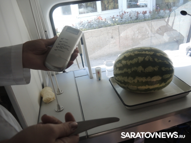 Представитель Саратовской МВЛ Светлана Александрова провела экспресс-тест ровенского арбуза в передвижной лаборатории, чтобы показать его безопасность. Для этого она использовала специальный прибор с трехцветной шкалой, втыкаемый прямо в мякоть проверяемого плода.