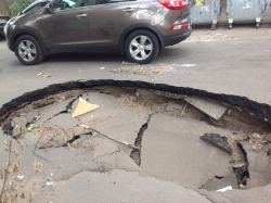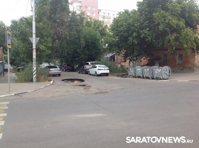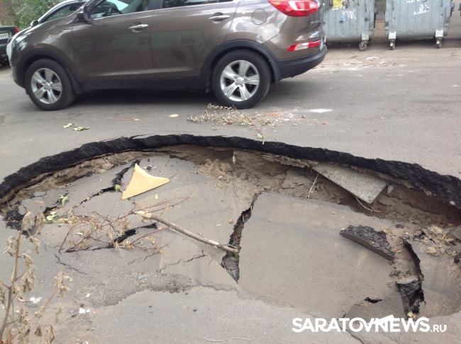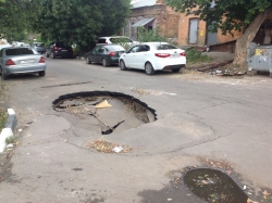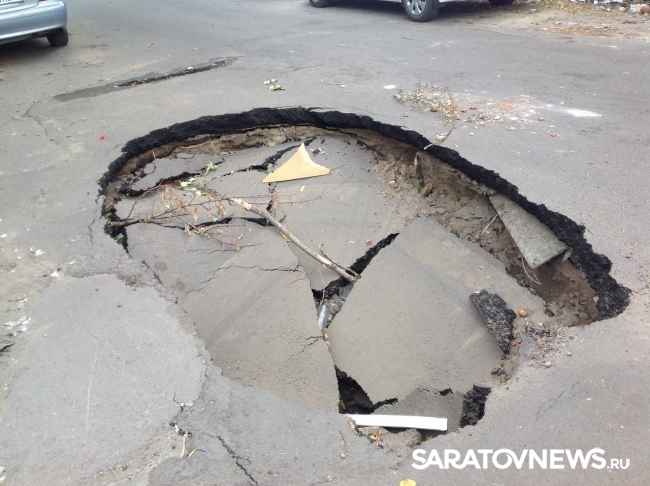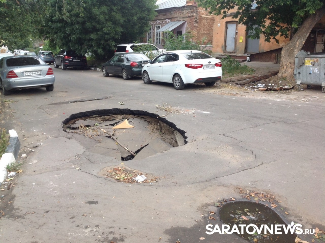 В центре Саратова на улице Вознесенской, неподалеку от пересечения с Челюскинцев из-за провалившегося асфальта образовалась огромная яма. Глубина провала около полутора метров, а размер такой, что вполне может вместить в себя даже внедорожник. Яма занимает одну из двух дорожных полос.