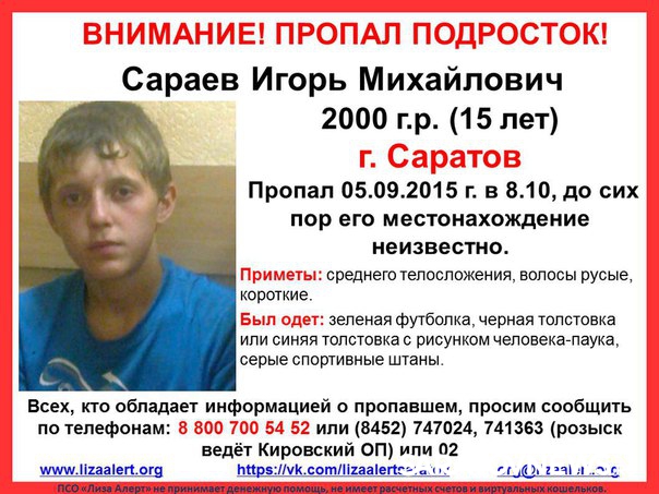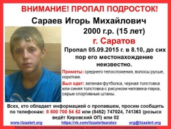 В минувшую субботу в Саратове пропал 15-летний подросток Игорь Сараев. Об этом сегодня сообщают волонтеры группы ВКонтакте "Лиза Алерт".