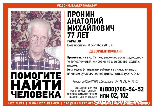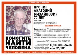 В Саратове 8 сентября пропал 77-летний Анатолий Пронин, который может быть дезориентирован, сообщается в официальной группе волонтерского движения "Лиза Алерт" "Вконтакте".
