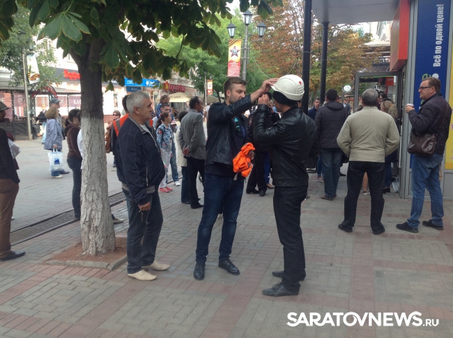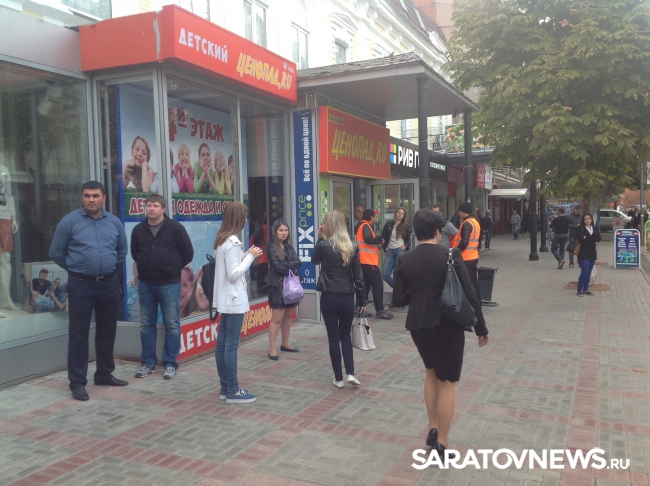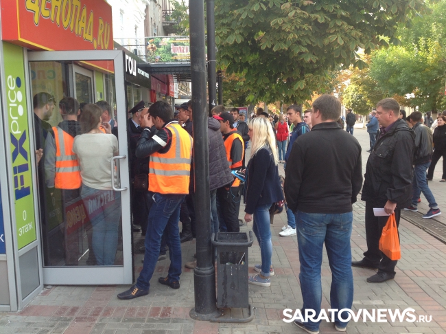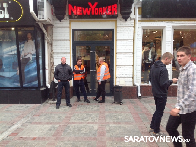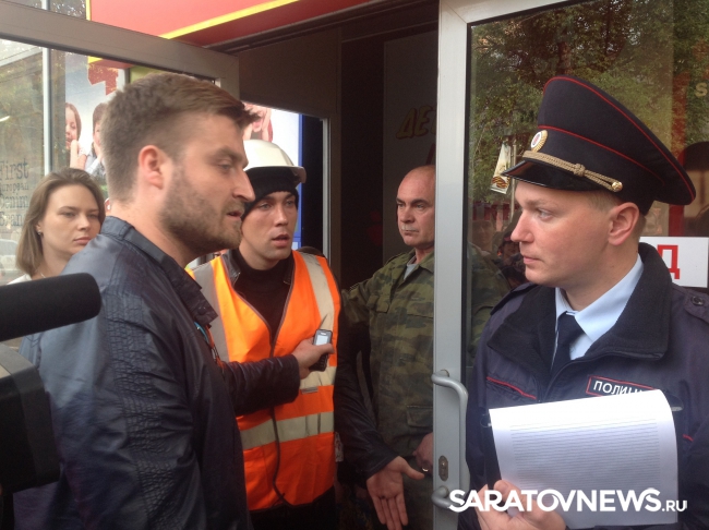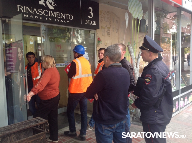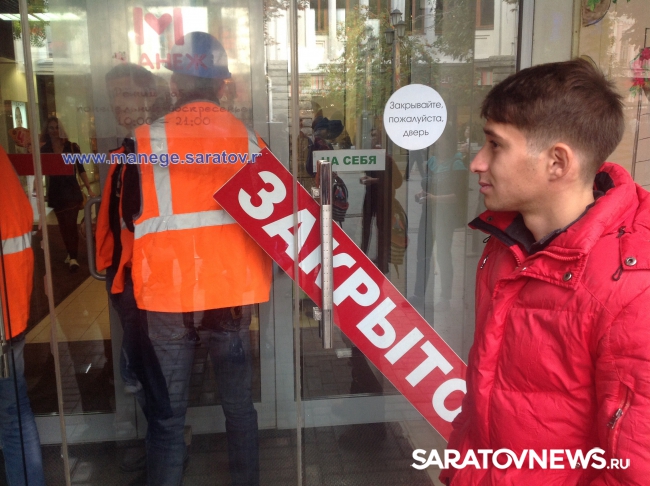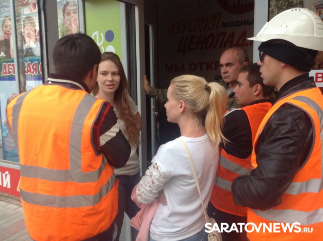 В Саратове группа людей, некоторые из которых в одежде строителей, пытается пробиться в ТЦ "Манеж", чтобы начать снос части здания. Эти граждане блокировали все входы в торговый центр и не пропускают покупателей в торговые павильоны. Разобраться в ситуации прибыли сотрудники полиции.