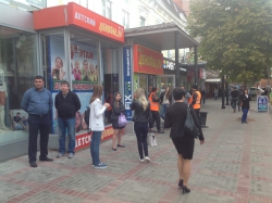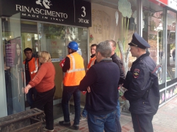 "Я приехала с района, оставила маленького ребенка, меня не пускает мужчина с запахом алкоголя", - говорит одна из покупательниц, указывая на рабочего в строительной форме, которая не смогла войти внутрь. На вопрос полицейского, почему рабочие занимаются самоуправством, мужчина отметил, что "это просто очередь в магазин и мы не препятствуем проходу людей".
