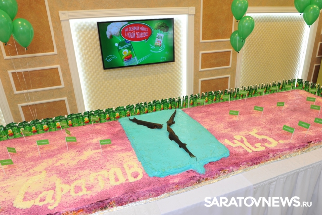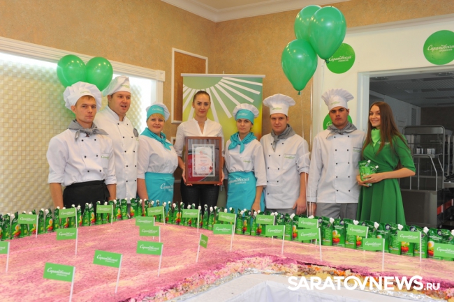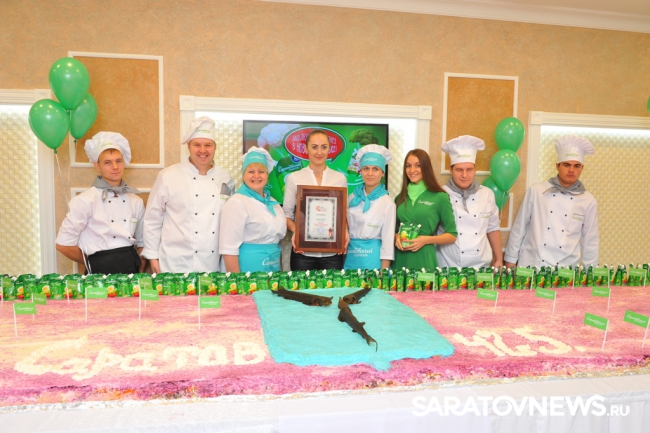 Какой же праздник без сюрприза? Именно так решили на Саратовском жировом комбинате холдинга "Солнечные продукты" и на День города приготовили коронное блюдо всех хозяек "Селедку под шубой". Салат получился всем на удивление, настоящий рекордсмен в прямом смысле слова – 631-килограммовое блюдо уже внесли в книгу рекордов России. Блюдо, над приготовлением которого ни один час трудилась команда поваров из двенадцати человек, получилось не только вкусным, но и красивым – в середине поместили съедобный герб нашего города с копчеными стерлядями.