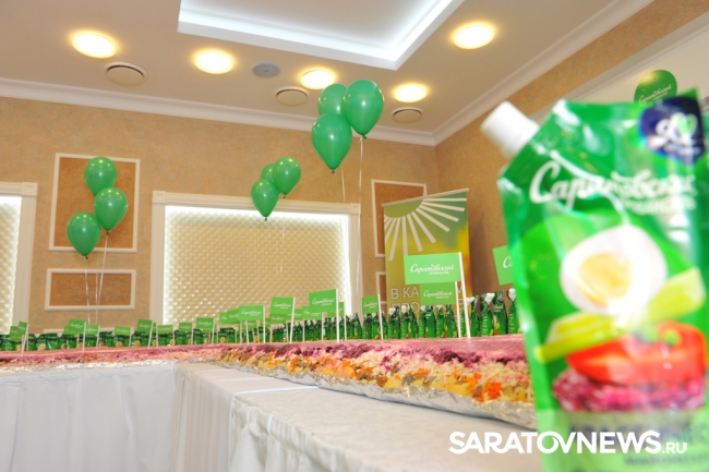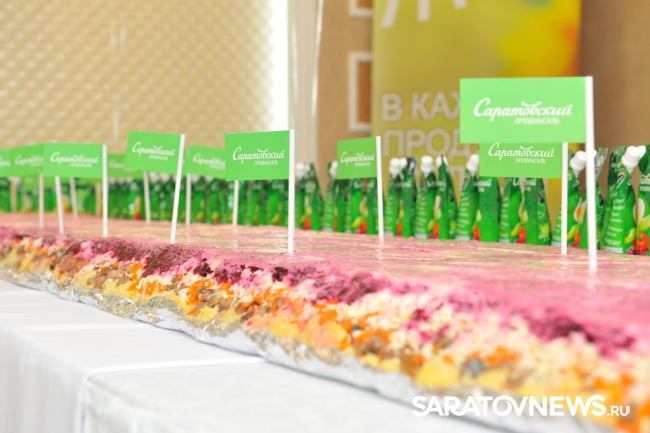 Кстати, на изготовление рекордного блюда понадобилось целых 70 килограммов майонеза "Саратовский провансаль". В него также вошли традиционные свекла, картофель, селедка и другие ингредиенты. "Мне кажется, что селедку под шубой можно назвать своеобразным брендом нашего города. Ведь Саратов стоит на Волге, в которой всегда водилось много рыбы, - отметила директор Саратовского жирового комбината Ольга Васильчикова. – История "Саратовского провансаля" начиналась с маленькой стеклянной баночки, сейчас мы выпускаем разный майонез, недавно он вышел в новой упаковке. Но главное, что вкус остался все тот же, знакомый с детства всей стране. Мы гордимся своим городом и своим продуктом, поэтому и решили сделать жителям такой подарок. А чтобы все смогли убедиться, что в новой упаковке по-прежнему любимый вкус на праздничных мероприятиях Дня города 850 упаковок (два раза по 425) были розданы горожанам абсолютно бесплатно".