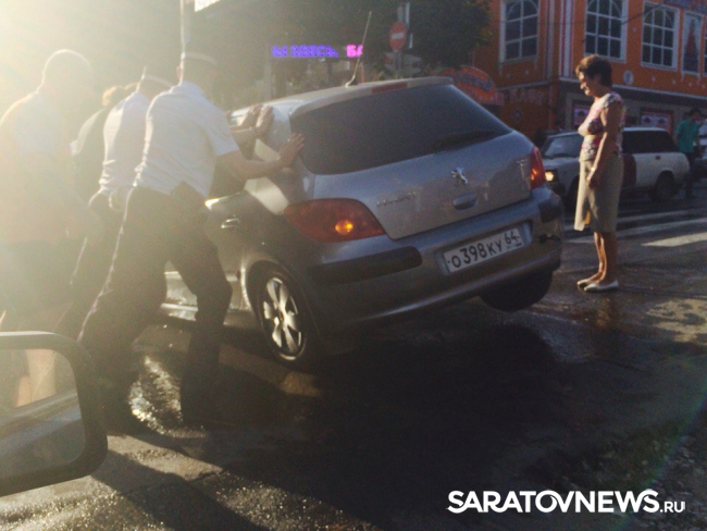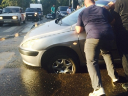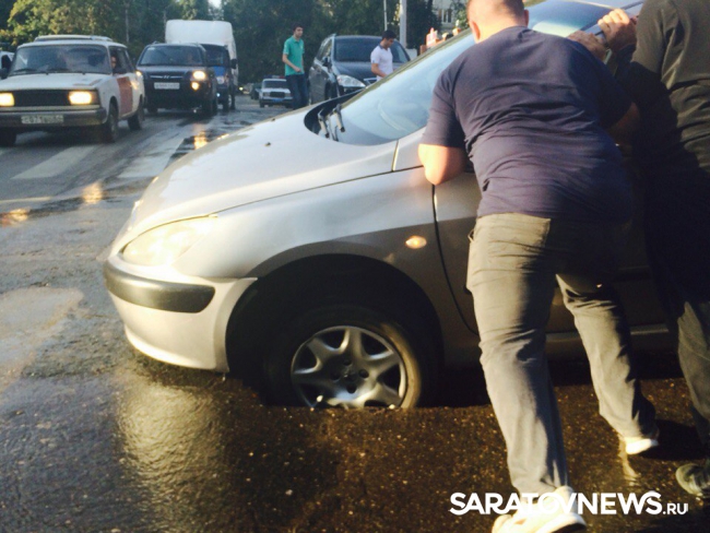 В дорожную яму, которая образовалась в Саратове на пересечении улиц Вольской и Чернышевского за сегодня провалилось уже две машины. Сначала в провал на дороге угодил "Пежо". Чтобы вызволить машину из западни даже потребовалась помощь двух сотрудников ГИБДД и нескольких крепких парней.