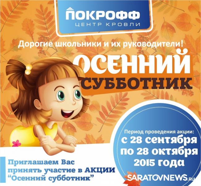 Саратовские школьники стали участниками акции "Осенний субботник с "Покрофф", которая стартовала 28 сентября. Напомним, акция объединит шесть городов – присутствия "Покрофф": Саратов, Саранск, Пенза, Ярославль, Кузнецы, Серпухов. Каждый из них будет представлять один трудовой отряд. От Саратова за звание победителей будут бороться девять учащихся 4 и 5 класса гимназии №4 Волжского района и их руководитель – старшая вожатая Баринова Наталья Алексеевна.